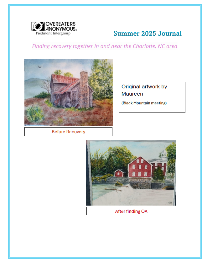 If you are an OA member and have writings on your experience, strength and hope on your OA recovery, please send your writings to journal@piedmontintergroup.org for our semi-annual newsletter.